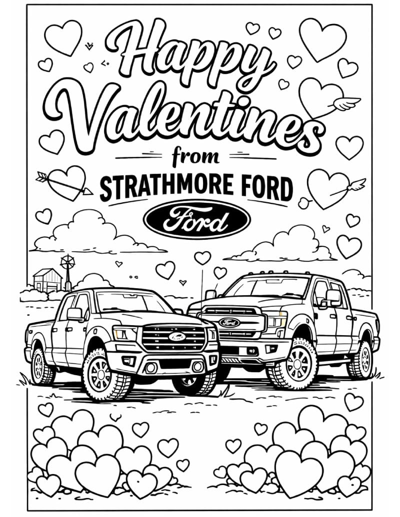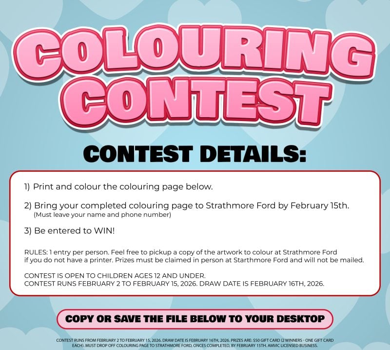 Must drop off colouring page to Strathmore Ford, once completed, by February 15th. AMVIC Licensed Business.
